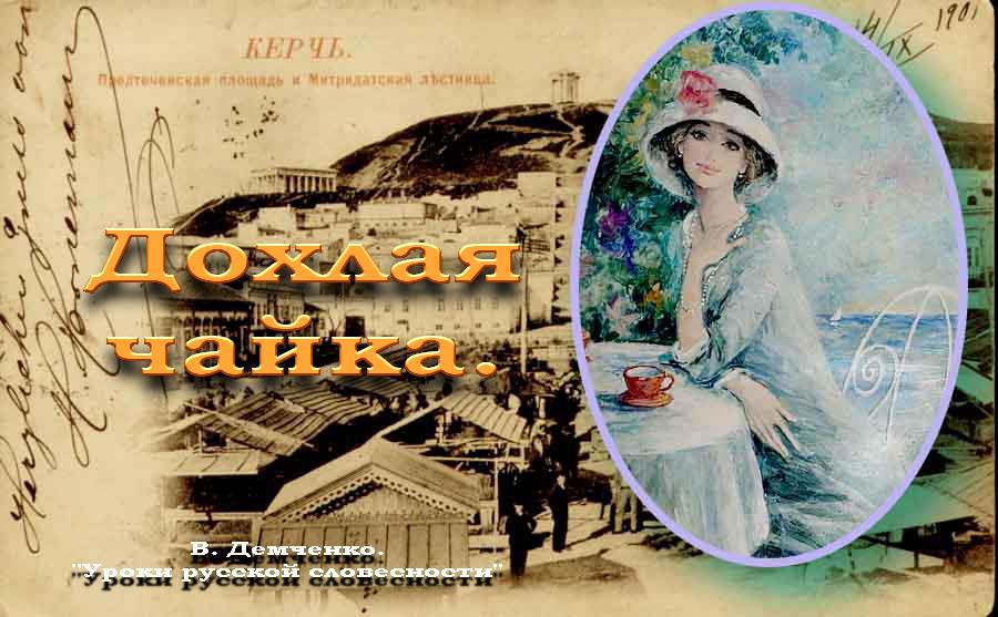 На Антона Павловича Фимочка смотрела расширенными глазами влажного аквамарина, в котором аптекарь отражался с актуальностью не большей, чем верстовой столб и это было немного досадно ему т.к. Фимочка Заречная была необыкновенно хороша собой: Вьющиеся локоны золотистой стружкой выбивались из-под ее соломенной шляпки на яблочно-румяные щечки; упомянутый аквамарин и рассеянные от милого носика рыжие канапушки навевали смелые мысли о морских волнах и песчаных пляжах Ниццы, с ее веселыми лодочными прогулками и будочками дамских купален с их нескромными тайнами… Антон Павлович зарделся. Одной рукой Фимочка придерживала на плече кружевной зонтик от солнца, другой держала двумя пальцами за хвост дохлую чайку, вернее, увесистого баклана с, удивленно разинутым, желтым клювом и, вываленным набок, морковным язычком; перья развернутых крыльев просвечивали розово…