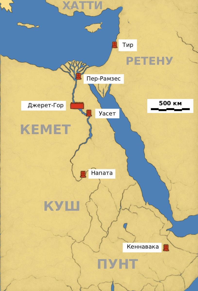 Некоторые географические объекты — например, крепость Джерет-Гор — представляют собой художественную реконструкцию, однако на территории к северу от Саути (современный Асьют) действительно располагалась египетская крепость.