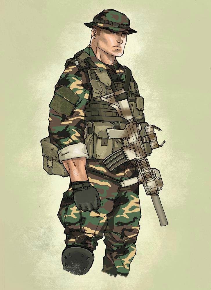 Сержант Джонатан Кларк, мускулистый, высокий мужик, был воплощением военной строгости, дисциплины и военной же фирменной безуминки. Его загорелая грубая, рельефно очерчивающая крепкое телосложнние, кожа выглядела контрастно на фоне песчаных цветов сержантской формы с закатанными рукавами.