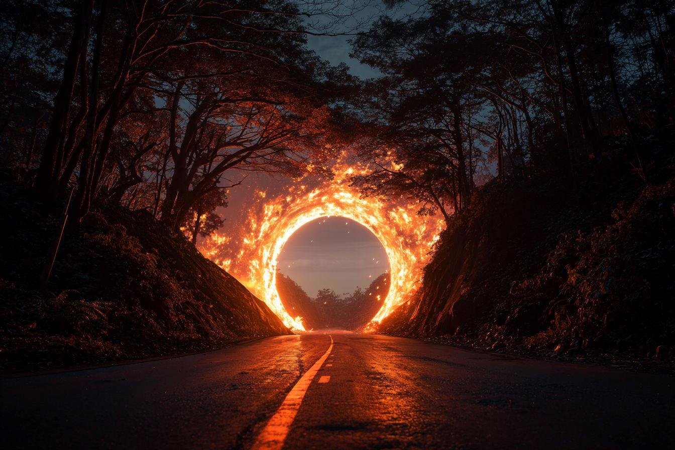 Пустынное полотно автотрассы, слабо освещенное закатом, словно исказилось перед автомобилем, неестественно изгибаясь и меняя свои очертания. Прямо посреди дороги, внезапно, вспыхнуло и стало стремительно разрастаться белое пламя, приобретая вид огромного огненного круга.