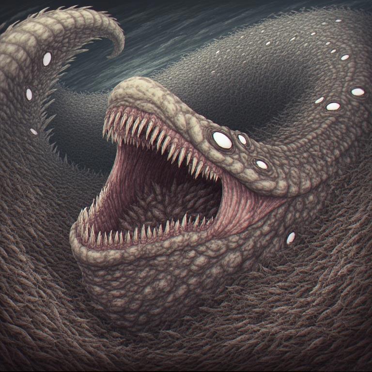 Оно извивалось, смеялось над ними и над самой природой, так как такого существа, просто не может существовать. Один его язык, которым он облизнул этот гроб, для них, был соткан из тысячей рыб, которые тоже смотрели на них. «Это было то, что создано для уничтожения расы или планеты», думали они. Долго продолжались их гляделки, пока они не заметили, что рыбы в его рту, те самые, которых м нашли рыбаки. Это и есть источник всех проблем, и он кажется, непобедим…