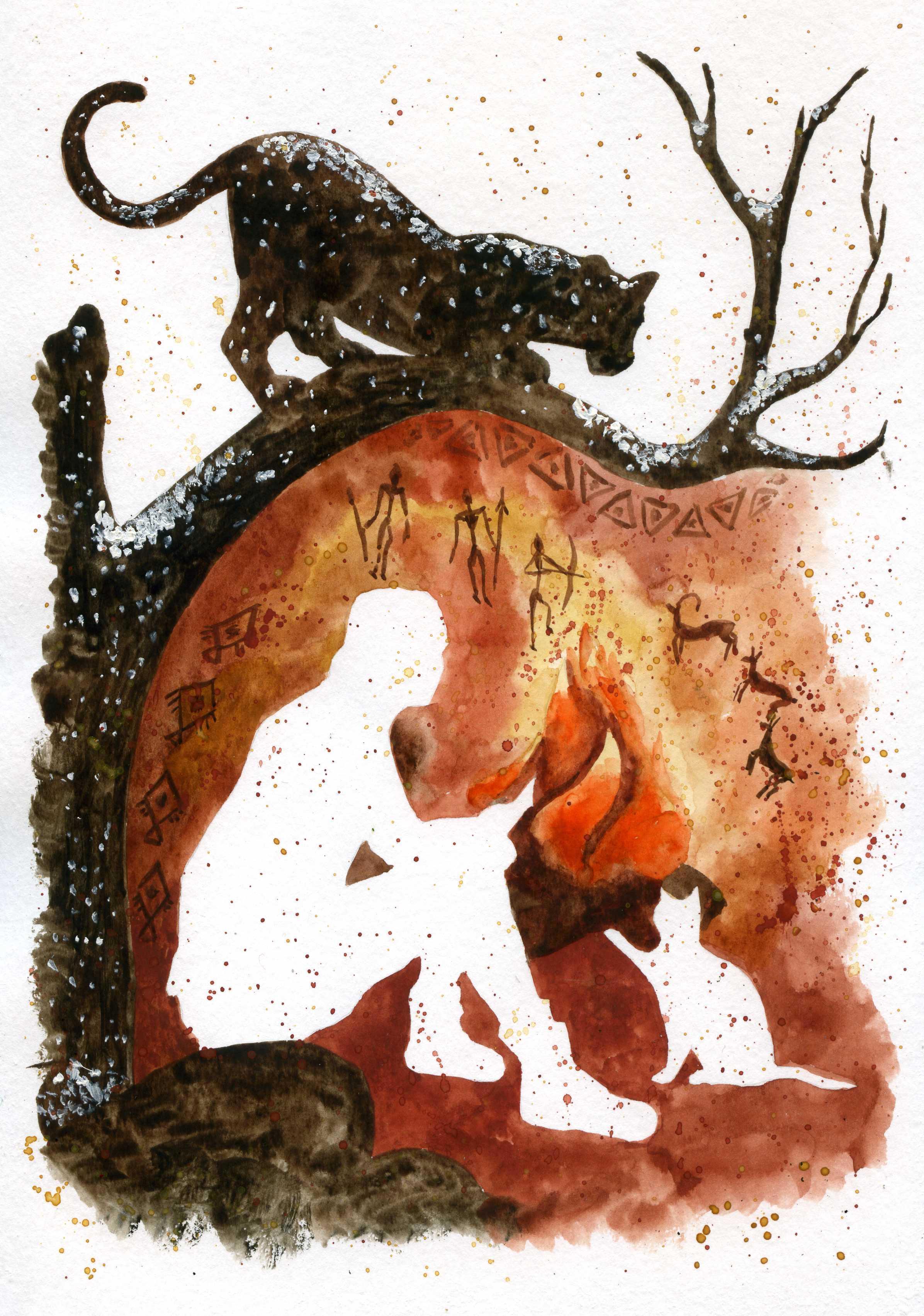 Лис бережно положил камни на пол пещеры и неожиданно для самого себя пустился в пляс. Глупая Лисица зря говорила, что его ум вытек! Зря смеялась! Он самый умный, самый удачливый из охотников, он разгадал хитрый камень, и теперь его одинокая зима будет не напрасной! За зиму он наделает много, много таких резцов, потому что на водопаде полно красных камней, похожих на ягоду, и с жилками внутри. А потом он сделает из одного такого камня наконечник нового копья и убьёт леопарда. И досыта накормит маленького кота потрохами большого хищника. Ведь если бы не маленький нелепый кот — он бы не уронил камень, а камень не раскрыл бы своей тайны.