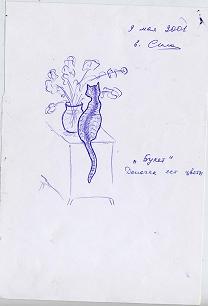 Цветы красивы, их хочется рисовать или, в крайнем случае, фотографировать. Коты тоже красивы, их хочется рисовать ещё больше. Коты любят жевать цветы и восседают при этом так изящно, что это просто нельзя не зафиксировать. Кошка поздним утром на столе объедает букет, остатками она потом поиграет в футбол вместе с другими котами, которые у нас живут.