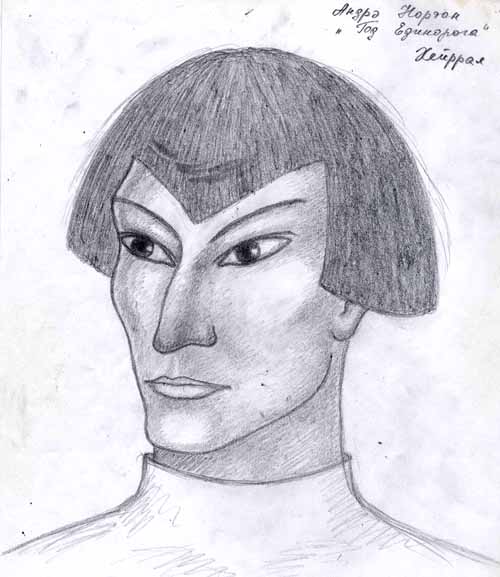 История страны, жители которой, поголовно обладающие магией, поддавались отрицательным чувствам вроде зависти и мести и почти полностью перебили друг друга — поучительна. Главный герой на самом деле обладает, кроме магии, очень сильным характером, потому что противостоять в одиночку обществу, страдающему снобизмом, представители которого только тем и занимаются, что третируют более слабого — сложно. А его внешность, которая почему-то всех отталкивает, мне понравилась — глаза, раскосые настолько, что расположены почти под прямым углом, и соответственно им выстриженная треугольная чёлка. И я его нарисовала. Итак, повесть Андрэ Нортон «Год единорога» и молодой человек, которого зовут Хейррал.