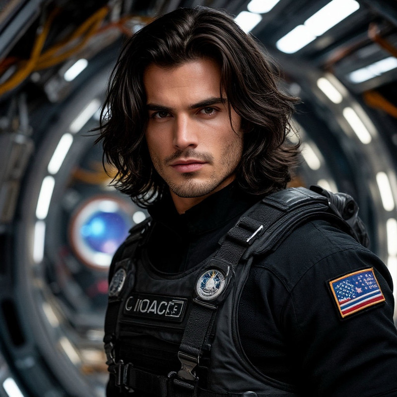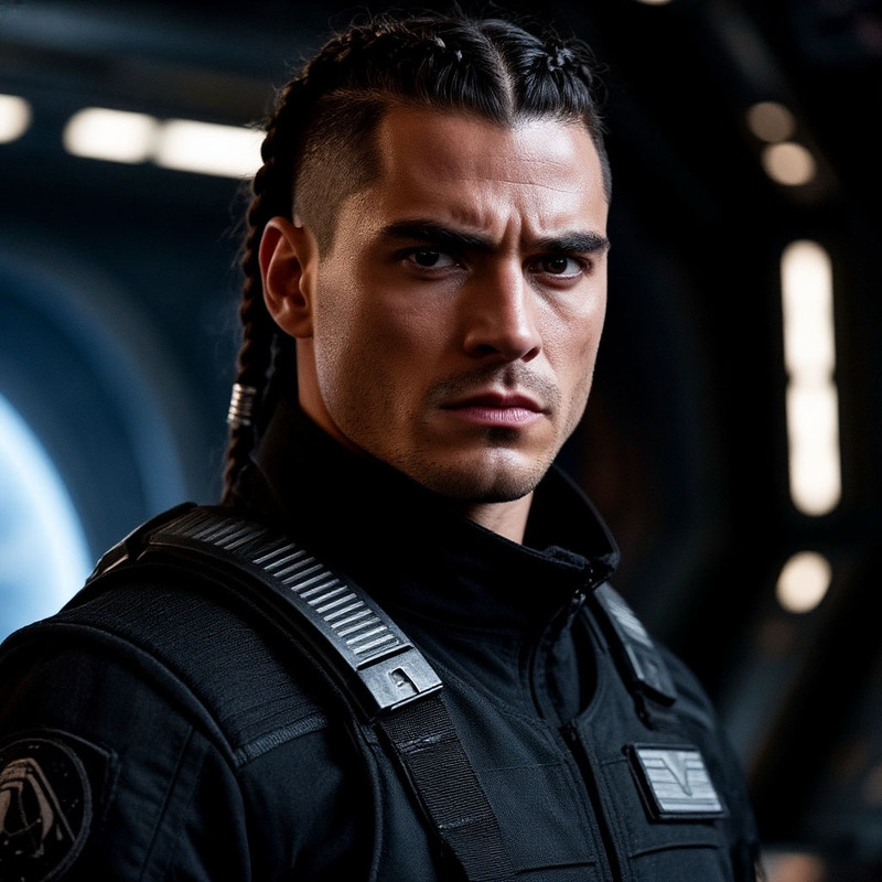 Но этот незнакомец, он отличается от всех. Его чёрные, как смоль, волосы заплетены в косы, а чёрная форма космического отряда смотрится…ну просто вау на этом мощном теле. Ощущение, что костюм в точности до идеала повторяет линии его мышц.