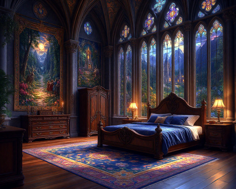 Массивная мебель из черного дерева – резной сундук, высокий шкаф с металлическими петлями, стол на изогнутых ножках. А окна... О боже, это же были настоящие витражи! Цветное стекло складывалось в сложные узоры, сквозь которые пробивался лунный свет.