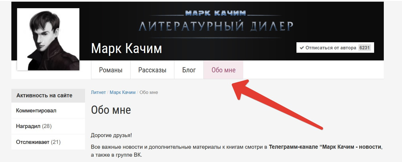 А еще в свете сегодняшних реалий я хочу напомнить вам, что в профиле на литнете есть вкладка "ОБО МНЕ".