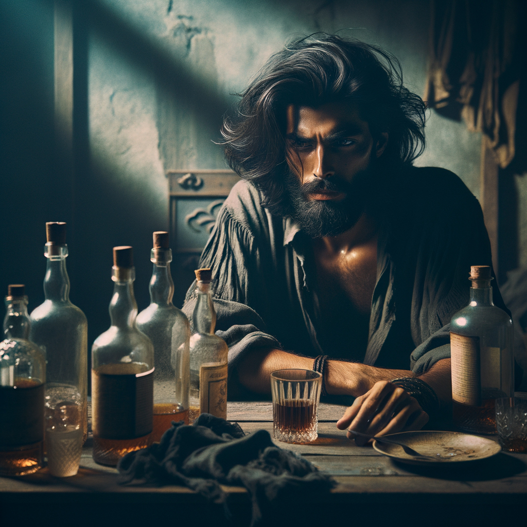 Выглядел он словно дикарь, нечёсаные длинные волосы сальными паклями висели вдоль лица, по самые глаза заросшего бородой. На мужчине был надет когда-то богатый, а сейчас весь засаленный и в пятнах камзол. Золотая вышивка на камзоле, конечно, никуда не делась, но вот сейчас было трудно понять какого он цвета, да и дыры на рукавах, из-по которых были видны волосатые руки тоже выдавали то, что, вероятно, этот костюм носили долгое время не снимая.