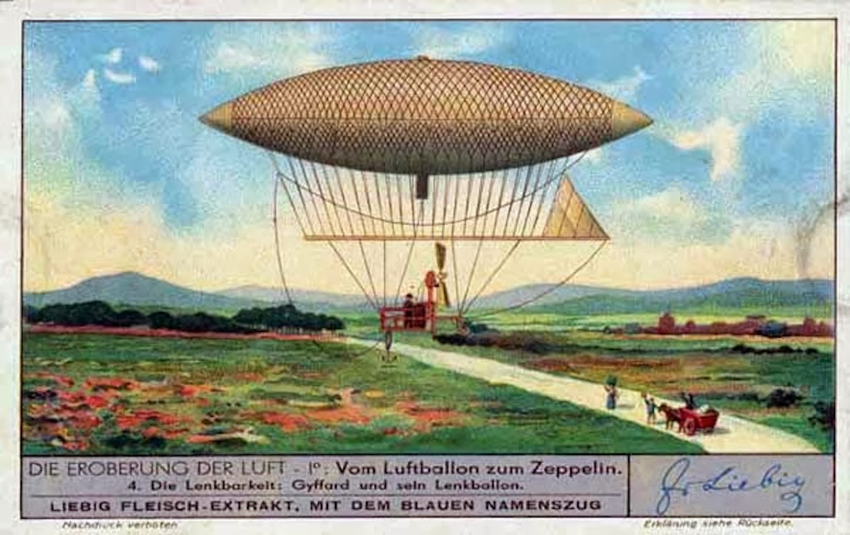 В сентябре 1852 года, примерно через 60 лет, идею Мёнье осуществил Анри Жиффар: аэростат имел сигаровидную форму, длину в 44 м и диаметр 12 м, вмещал 2500 куб. метров газа и управлялся воздушным винтом. Винт дирижабля Жиффара приводился во вращение паровой машиной. Масса машины являлась существенным недостатком для мощности: она составляла 50 кг, а вместе с котлом — 150 кг. Подъемная сила дирижабля равнялась 1700 кг, однако, вес его составлял целых 1500 кг. На воду, балласт и топливо оставалось всего 200 кг. От того мощность была слишком мала.