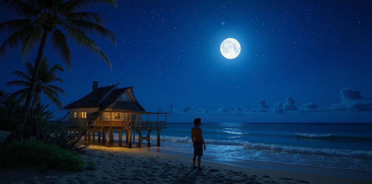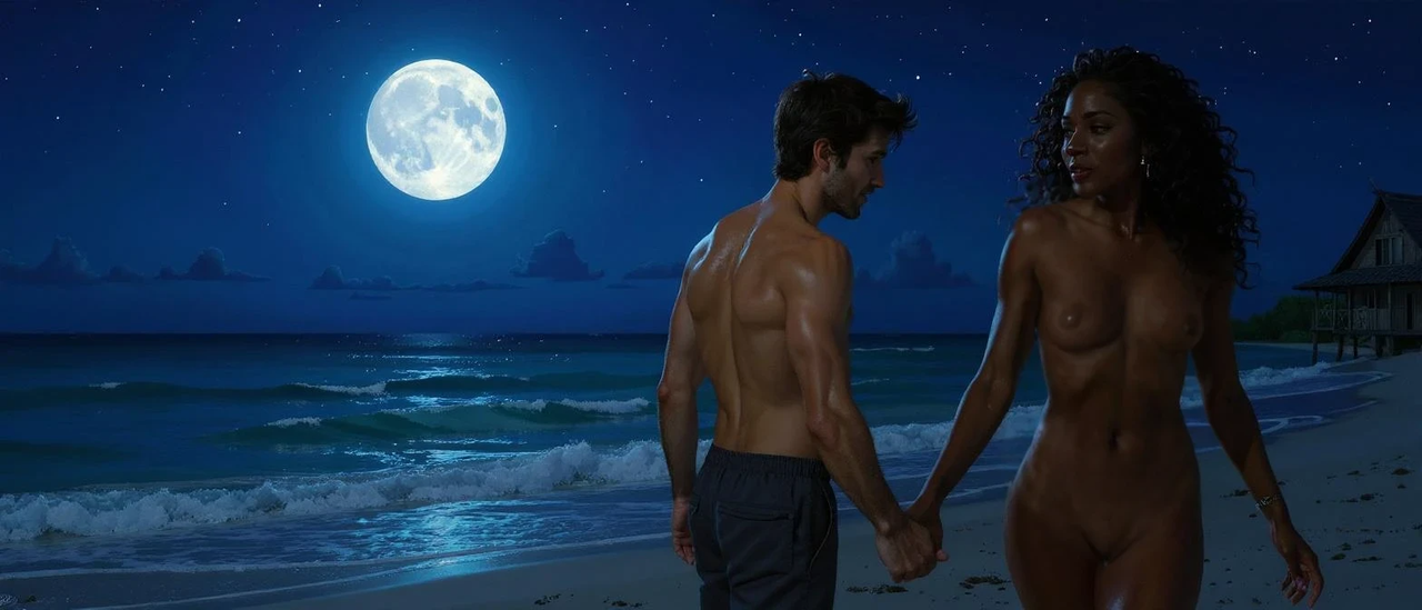 После полуночи взошла лунища.Весь мир стал голубым,панель и обшивка кабины,передняя верхняя палуба и даже кожа Ника.