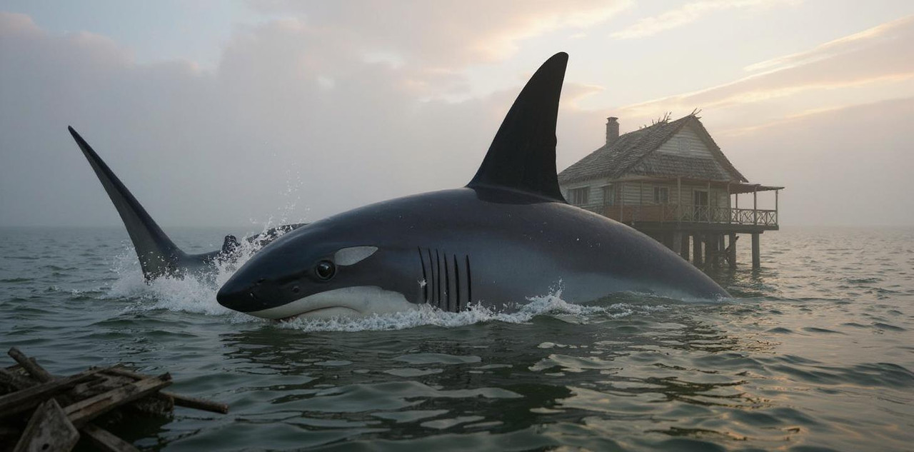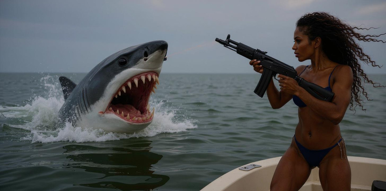 Промахнувшаяся тварь обрушилась в море поднимая волну...Плавник устремился за катером.