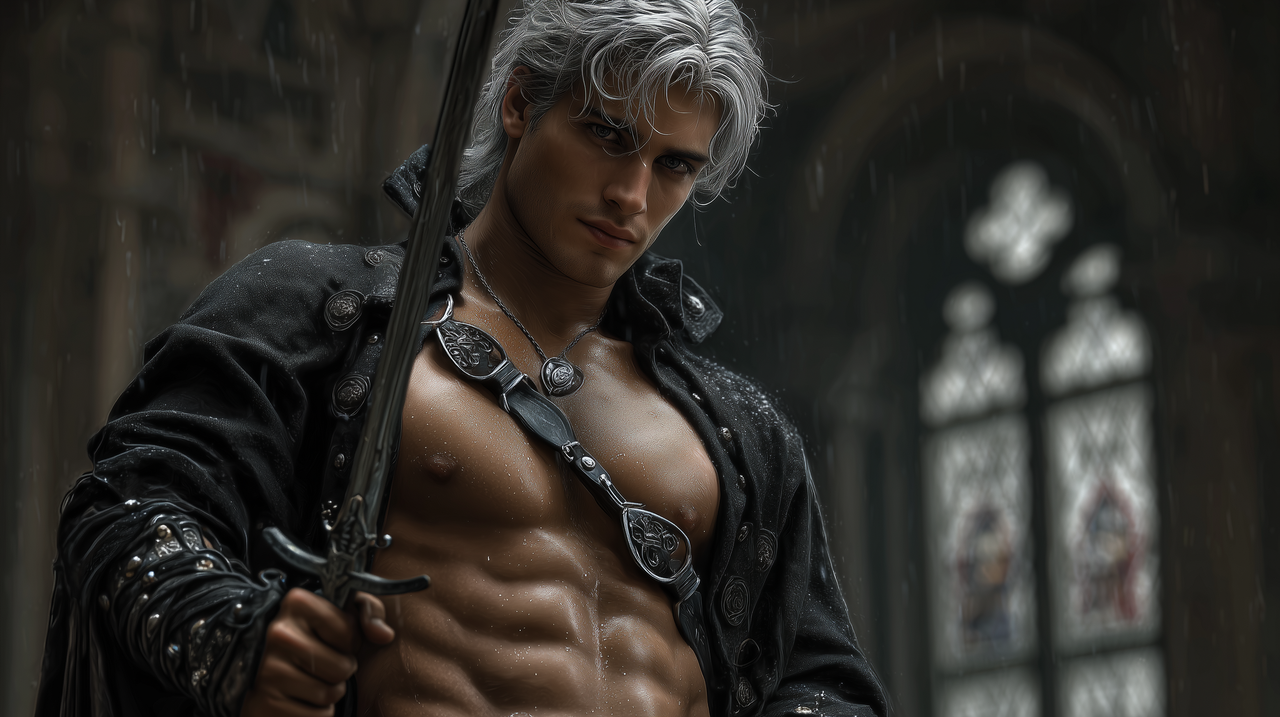 Красивый, высокий, с широкими плечами и узкими бёдрами, на нём распахнутая чёрная туника — как вторая кожа на теле, облегает мышцы, ремни на поясе чуть позвякивают от каждого шага. Райтфорт — бог войны в мужском обличии, проходит внутрь, будто он и этот мрак неотделимы.