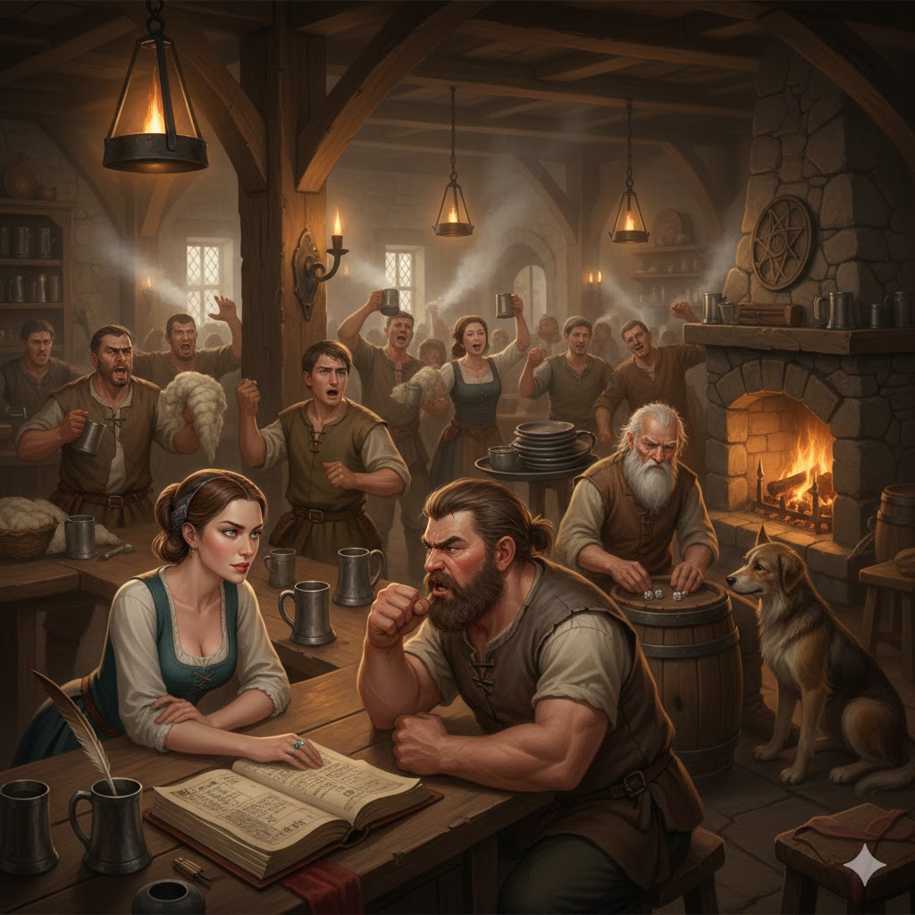 В таверне «Старый Клён» стоял тот самый предвечерний гул, который Арина любила и ненавидела одновременно. Воздух был густой, как кисель: запах жареного лука и тушёной баранины, хмельная перегарная нота, дымок от камина и вечная пыль с дороги, которую не выметали никакими силами. За одним столом спорили о ценах на шерсть, за другим уже пели протяжную, чуть фальшивую песню. У двери старик Климка играл в кости сам с собой, а его пёс Барбос, свернувшись калачиком, прикрывал лапой нос.