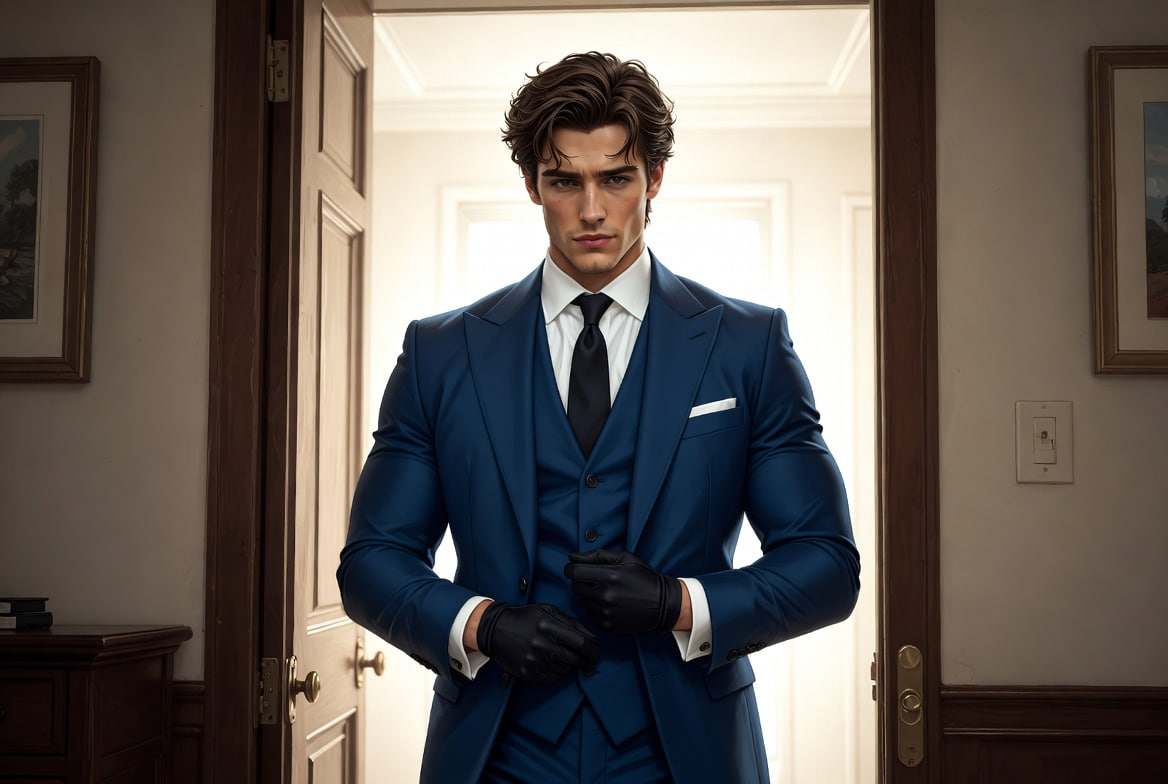 На пороге стоял мужчина. Высокий, широкоплечий, в безупречном темно-синем костюме-тройке, который сидел на нем идеально. Его каштановые волосы слегка вились, а на лице играла тонкая, едва заметная усмешка.