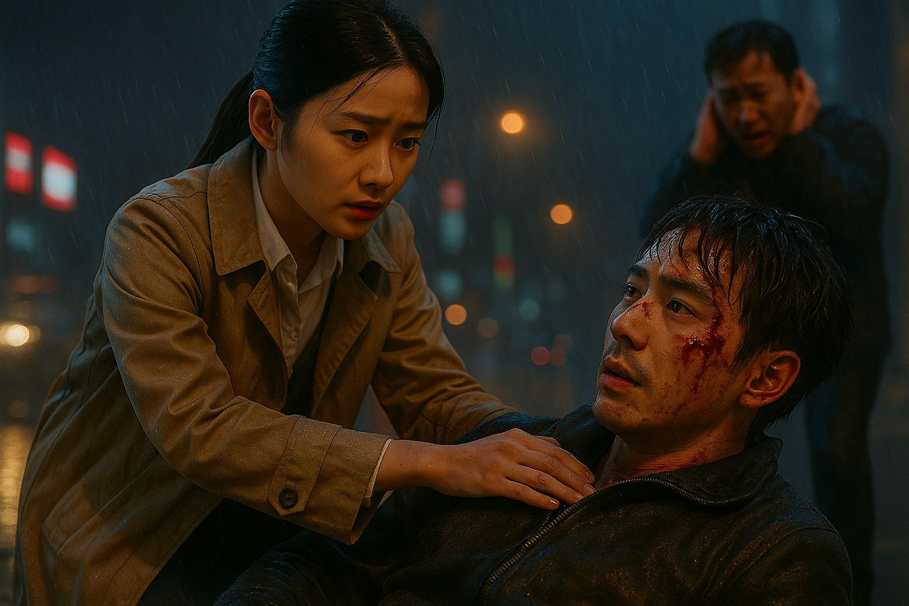 Секунда, и тело Хэюн словно перешло на автопилот. Она побежала к упавшему, плащ прилип к ногам от дождя, кроссовки предательски скользили на мокром асфальте.
