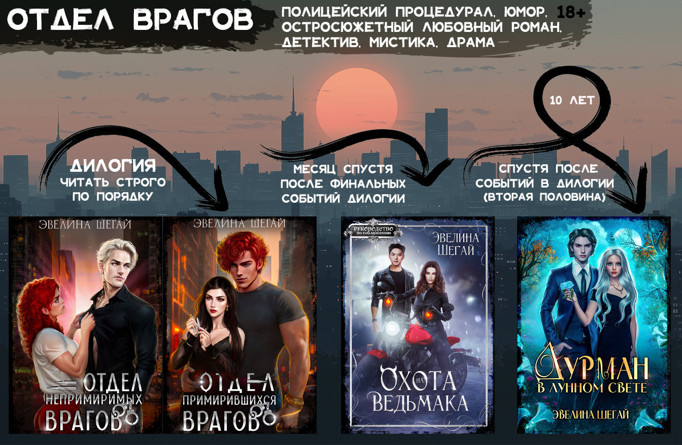 Моё главное детище, с которого всё началось в марте 2022 года. Два месяца я потратила на продумывание вселенной, а уже в мае начала писать «Отдел непримиримых врагов».