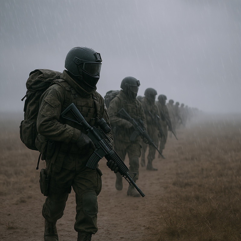 Утром на заре всех подняли сержанты. Построение, укладка спальных мешков, все остальное уложили вечером и выход. Шлем на голове. С непривычки неприятно давят уплотнители на ушах и шее.