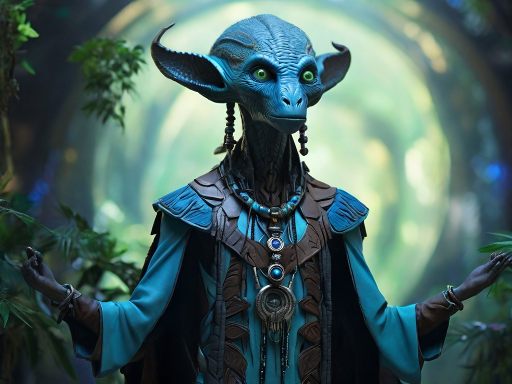 Тут открылась дверь, и в кабинет вошло, любопытно озираясь, невысокое зелёное существо с большими ушами, вытянутым лицом и совсем тощим телом. Его взгляд прошёлся по кабинету. При виде меня туземец улыбнулся, звякнув бусами на длинной шее.