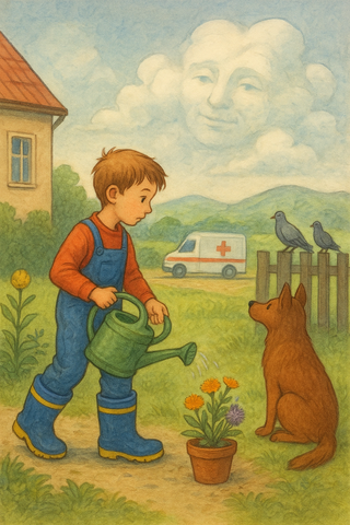Он поливал бабушкины цветы — лунную календулу, которая цвела только ночью, и звёздный чертополох, что светился в темноте. Необычные цветы. Волшебные.
