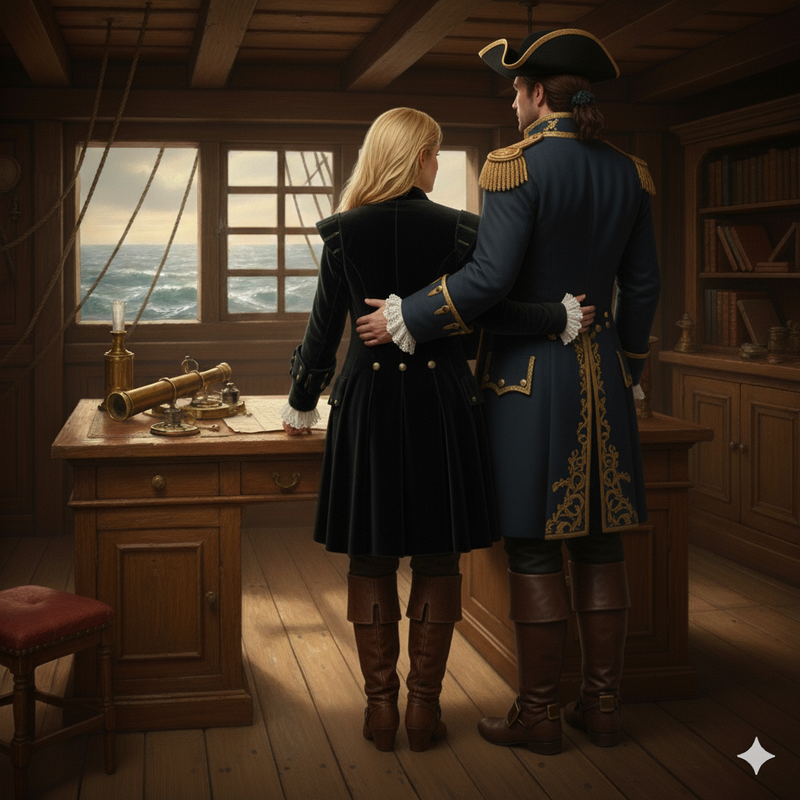 Капитан приблизился к ней и осторожно присел на краешек постели,готовый отпрыгнуть в сторону в любой момент.Повседневный кафтан промок и он надел парадный,шитый золотом на груди и манжетах.