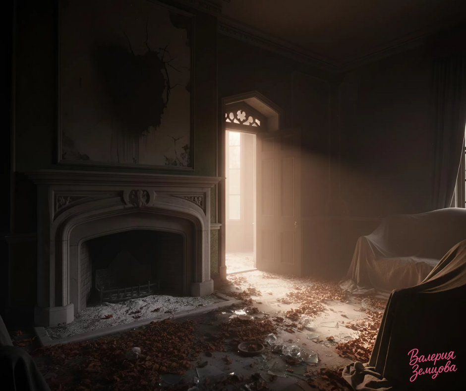 Я прошла в первую же комнату. Гостиная. В камине лишь горстка мертвой золы и опавших листьев. На стене - огромное, потемневшее от времени пятно, где когда-то висел портрет.