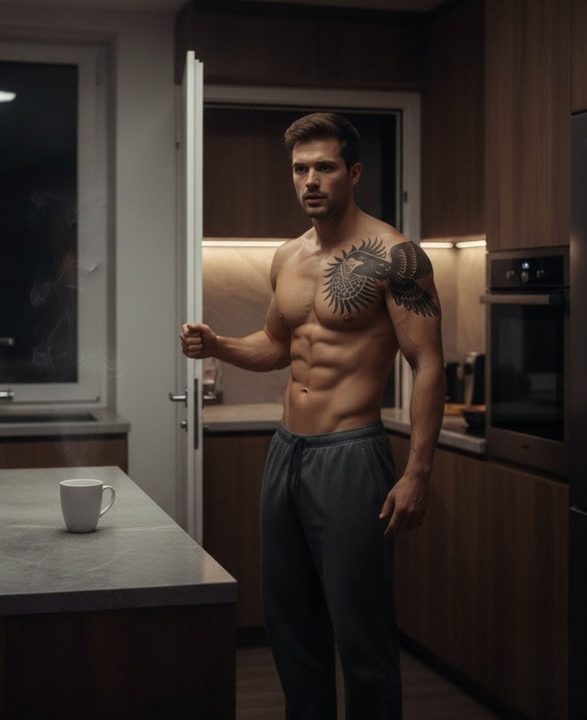Передо мной настоящее произведение искусства, результат трудов двоих родителей, матушки-природы и тренажерного зала – широкие плечи, рельефная грудь с татуировкой в виде сокола, пресс с шестью убийственно-соблазнительными кубиками и уходящие под резинку штанов косые мышцы.