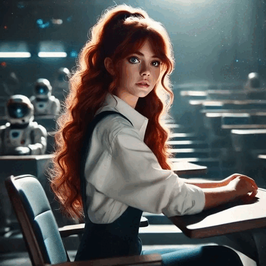 Она стоит у входа в блок, небрежно прислонившись к стенке, скрестив длинные, идеально ровные ноги. Узкий, облегающий костюм подчёркивает каждую линию тела. Волосы — белый шелк, собранный в высокую причёску, лицо безупречное, с идеальной симметрией. Губы чуть подкрашены чем-то влажным и блестящим.