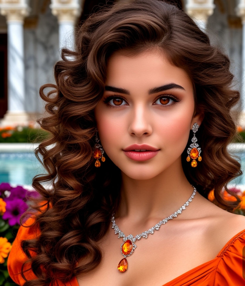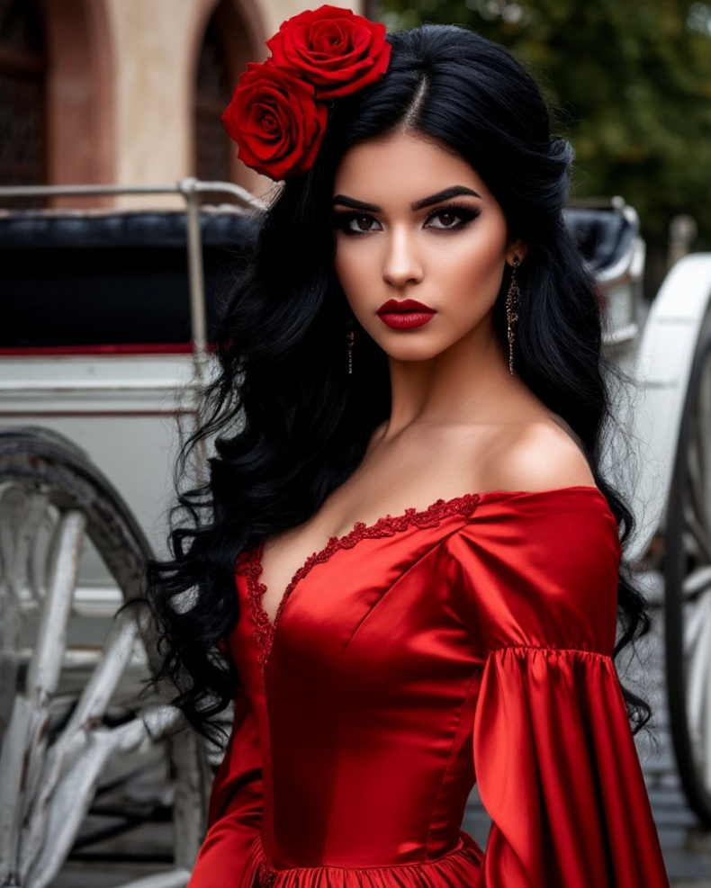 Её длинные чёрные волосы собраны в красивую причёску, завитые локоны опускаются на плечи, укрытые лёгким шёлковым плащом молочного цвета.