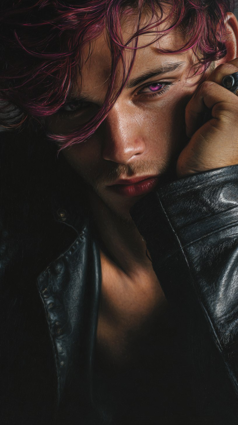 Красная, кожаная куртка, черные штаны и идеально белые кроссовки сразу бросились мне в глаза. Парень пристально смотрел на меня своими фиолетовым глазами? Определённо линзы — подумала я и, продолжая рассматривать его в ответ, заметила на его лице пару довольно глубоких порезов на носу и в области подбородка. Ярко красная кровь натолкнула меня на мысль, что парень недавно с кем - то подрался, поэтому его раны были свежие и ещё немного кровоточили. Не скажу, что я прониклась к нему сочувствием. Слишком уж у него нахальная рожа. Он явно считает себя альфой. Я же не разглядела в нем ничего привлекательного. Красная шевелюра в модных традициях этого года смахивала на петушиный гребень, а лицо казалось каким - то несуразным. Слишком уж он кривил физиономию, чтобы казаться более брутальным. Как по мне, он только все испортил. За его гримасами возможно и скрывается что- то приличное, но в данный момент в этом парне абсолютно нет ничего естественного. Так и хочется сказать «переигрываешь, дружок. Сделай мину попроще, смотреть тошно на твои кривляния».