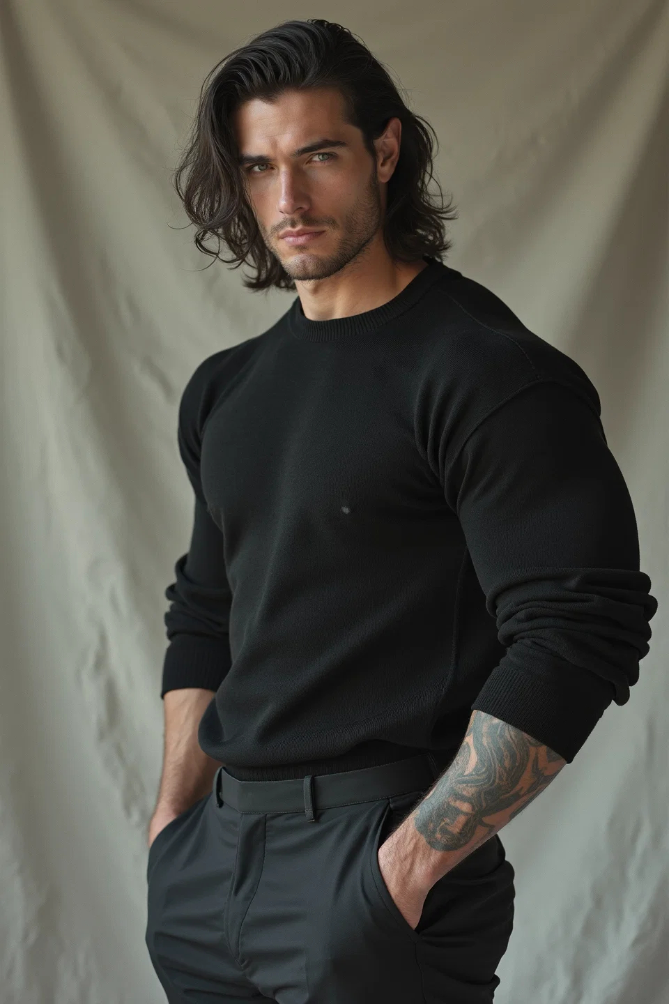 В белой рубашке с расстегнутым воротником, темные длинные волосы зачесаны назад, открывая высокий лоб, и те же черты лица, отточенные годами.