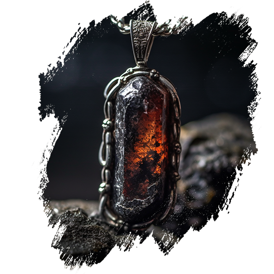 Амулет Повелителя Мёртвых – кулон из гетита, камня красно-коричневого цвета игольчатой структуры в серебряном обрамлении на серебряной цепочке.