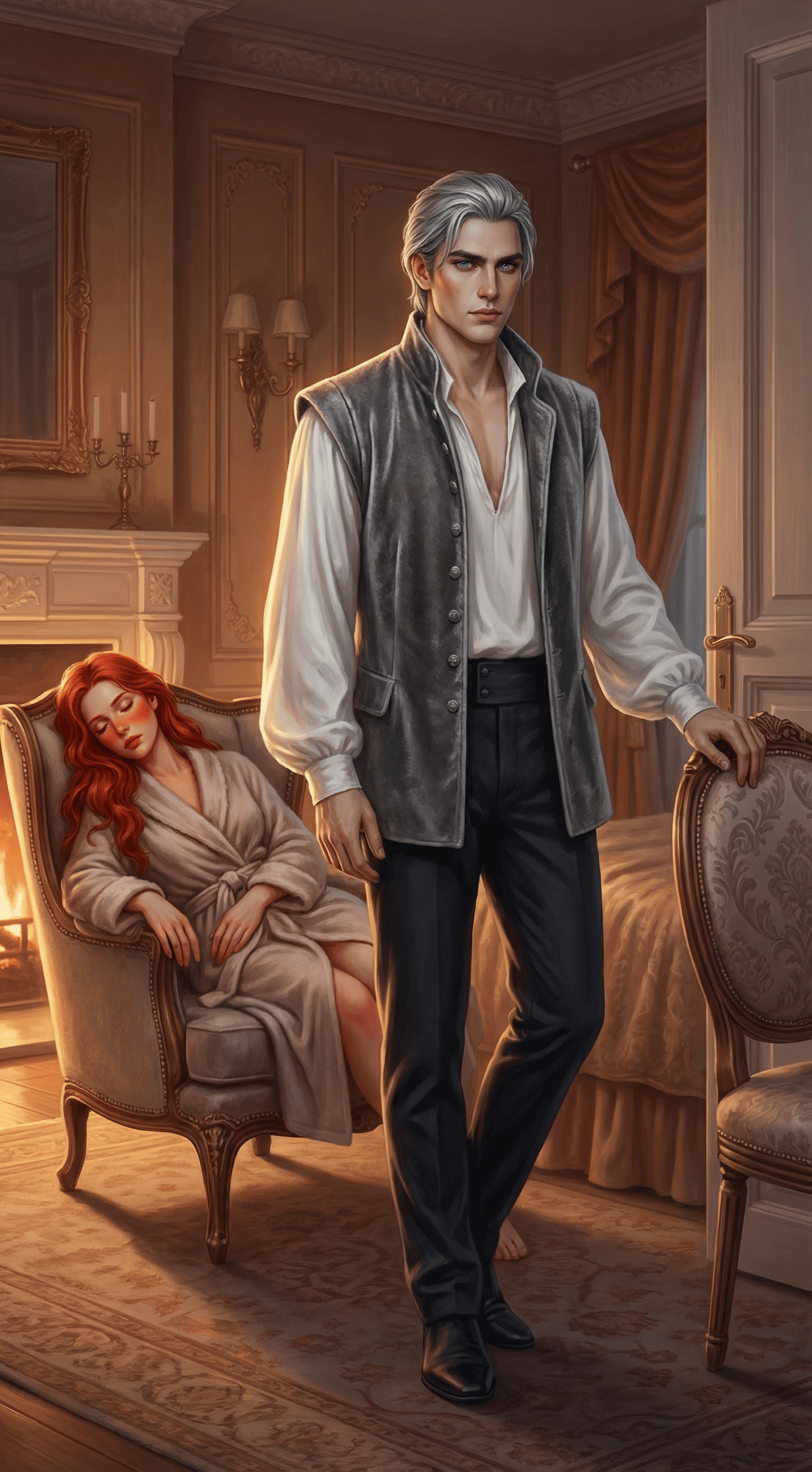 Его взгляд скользнул по комнате, отмечая сделанную мной груду щепок у стены, мокрое пятно на ковре у камина (таял лёд) и, наконец, остановился на своём запястье, на котором красовался свежий синяк. На мгновение его глаза, холодные и аналитические, задержались на хаосе комнаты, и в них мелькнуло что-то неуловимое — не только подозрение, а тень почти физического дискомфорта, будто этот беспорядок отзывался в нём глухим, забытым эхом. Но миг прошёл, и маска вернулась.