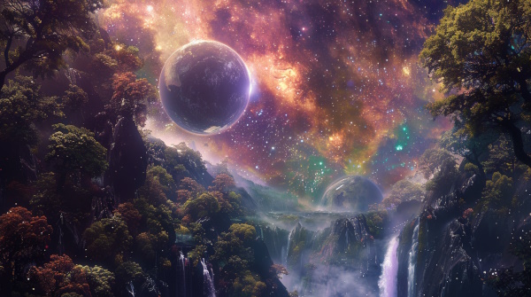 Стелла выпрямилась на лапках и стала оглядываться. Странным казалось место, куда она таким таинственным способом попала. Будто и природа похожа на земную, но всё же другая... Небо другое... Здесь, с обрыва, у которого сидела, видны планеты, звёзды... Так, как не видны были с Земли никогда. Водопад за озером блестит не как в родных краях, а его вода, казалось, падала так мягко, так нежно, словно была смешана с белоснежным молоком.
