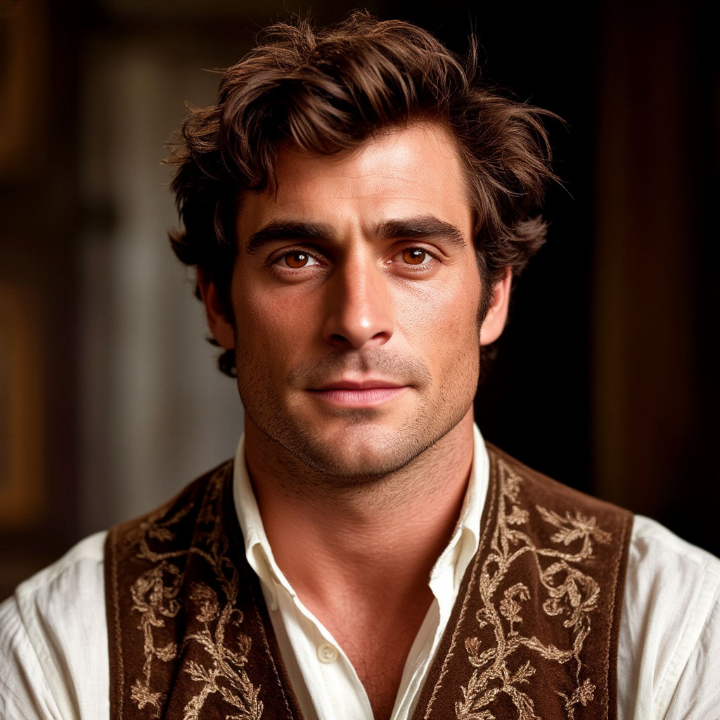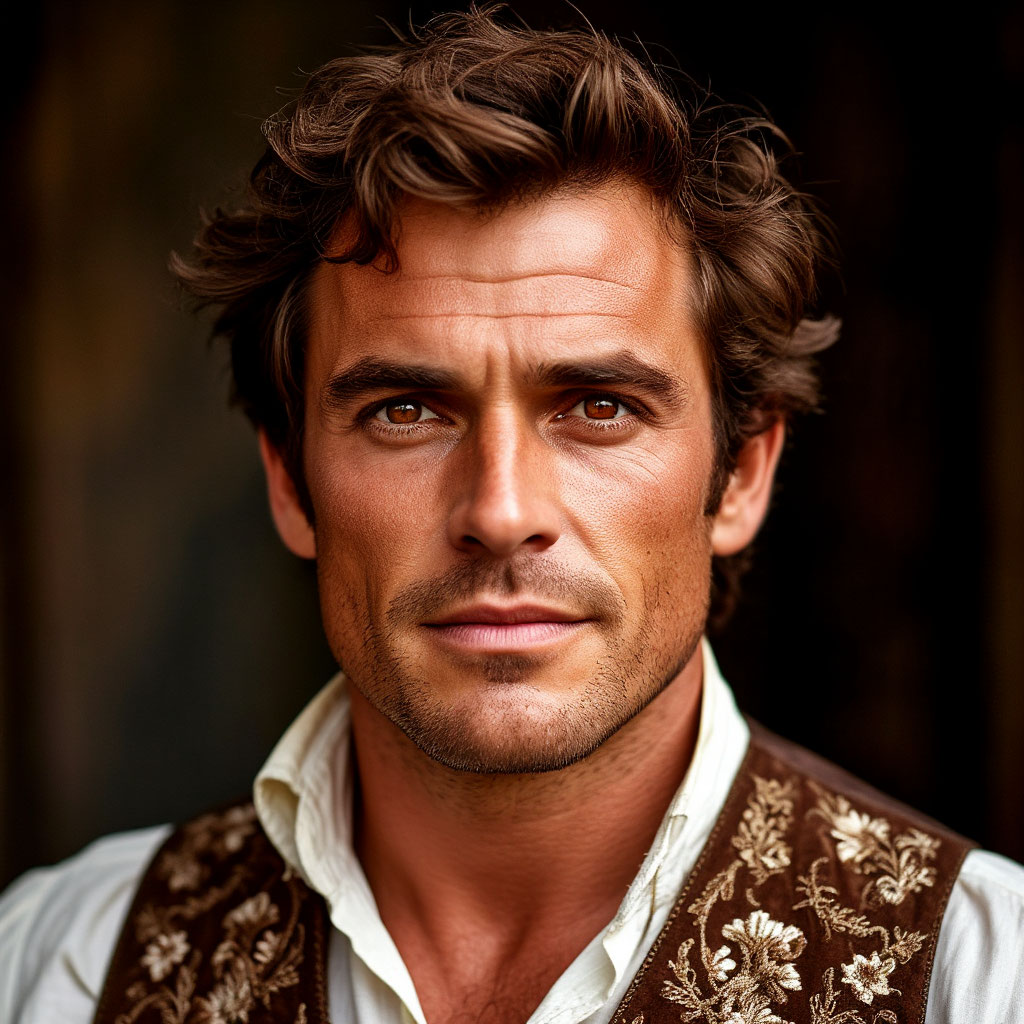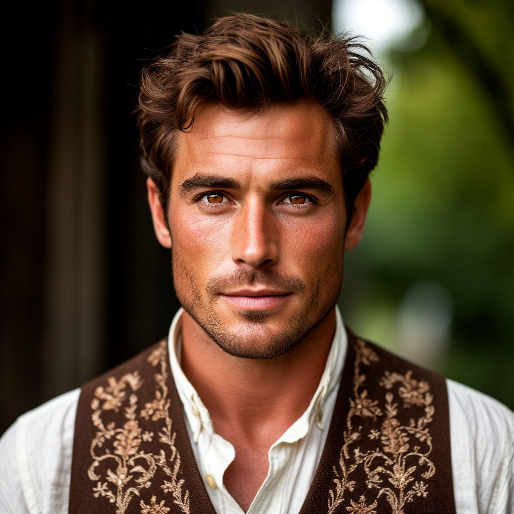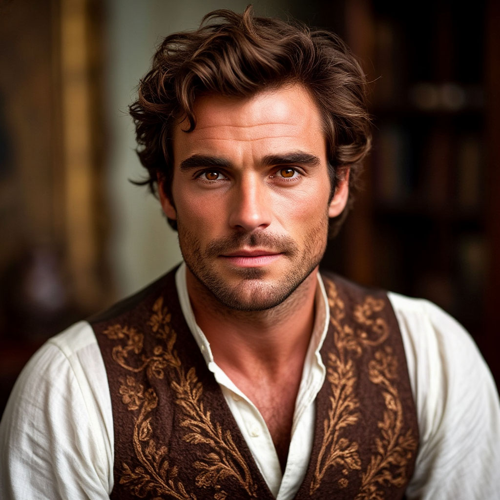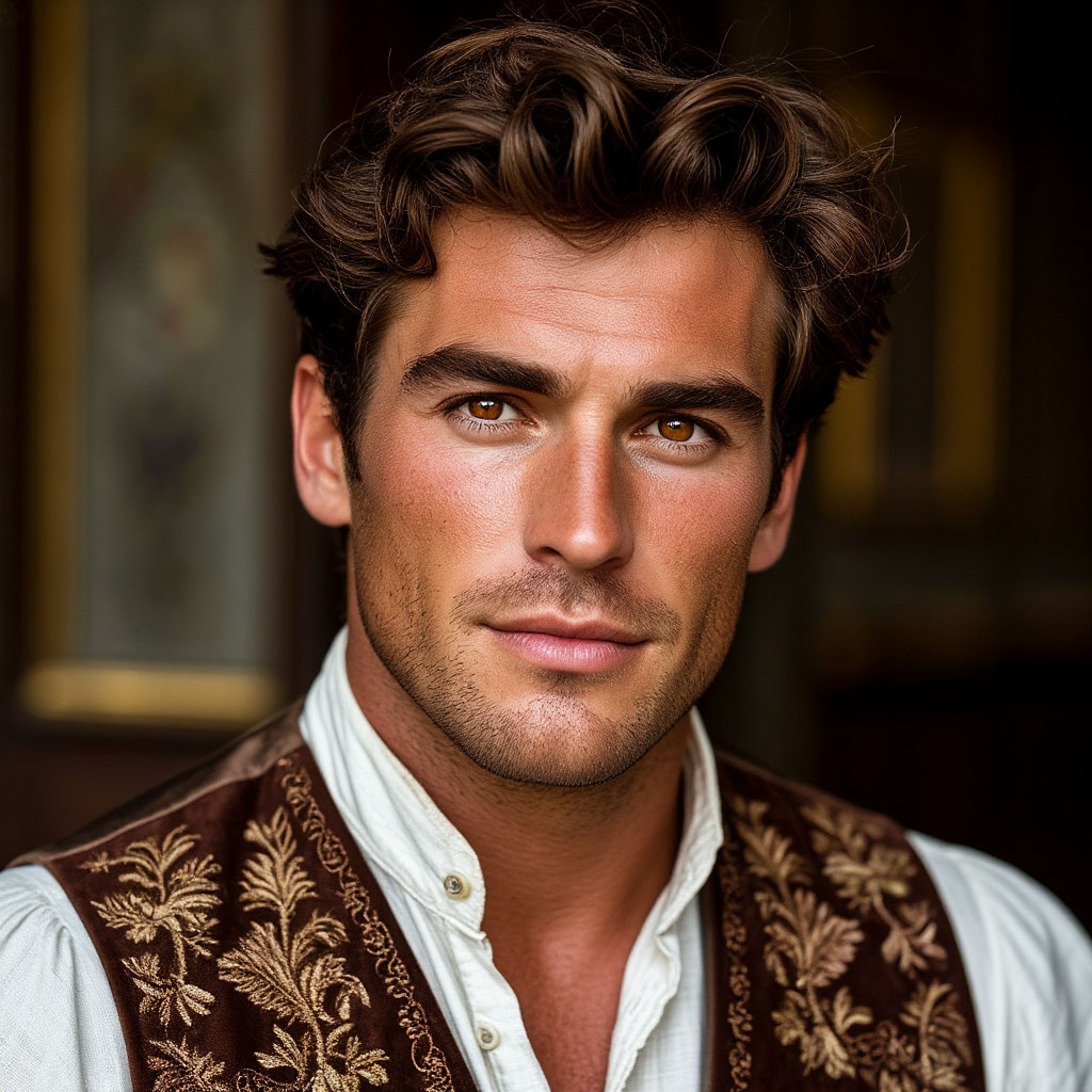 Белая, довольно дорогая рубашка, вышитый жилет шоколадного цвета и немаркие практичные брюки. Взгляд на мгновение замер на шее и ключицах мужчины – там, где ворот рубашки был расстёгнут.