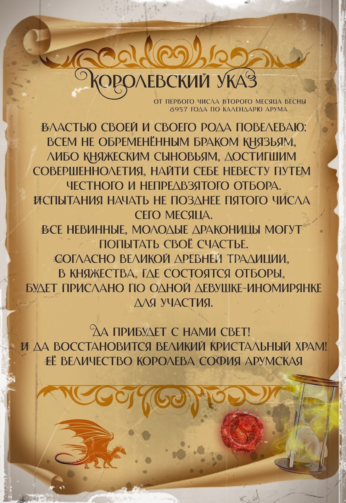 — Ваша Светлость, — нагоняет меня старик и снова низко кланяется. — Пока вы были на охоте гонцы от его Величества Королевы Софии принесли указ… об отборе невест! — он немного запинается, но всё же произносит эти ужасные слова.