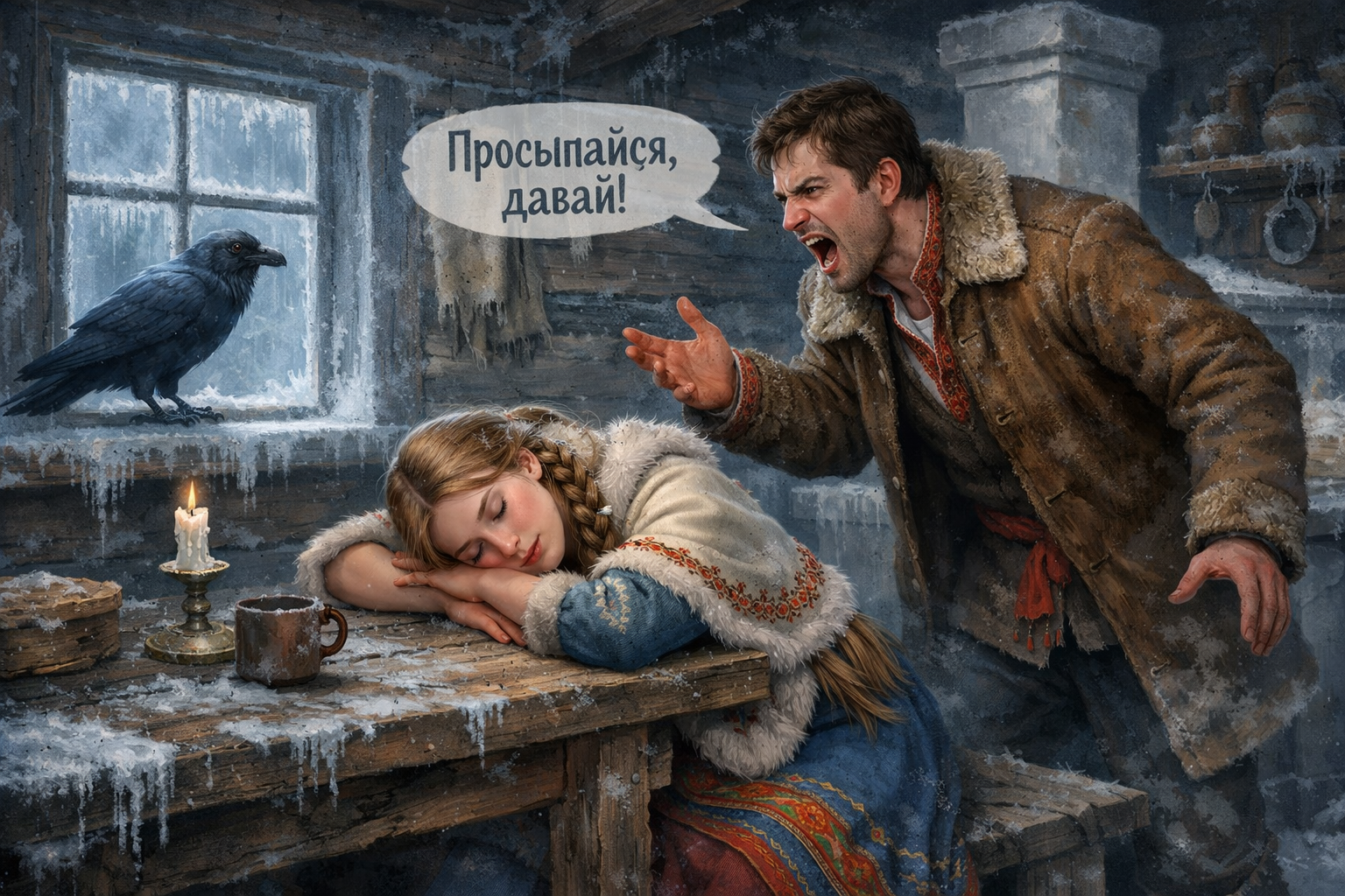 – Вовремя ты очнулась, Аленка, – произнес ворон. – А то еще немного полежала, тебя б в холодную и унесли. А то печь не затопила, домой не пошла, так и замерзнуть заживо недолго.