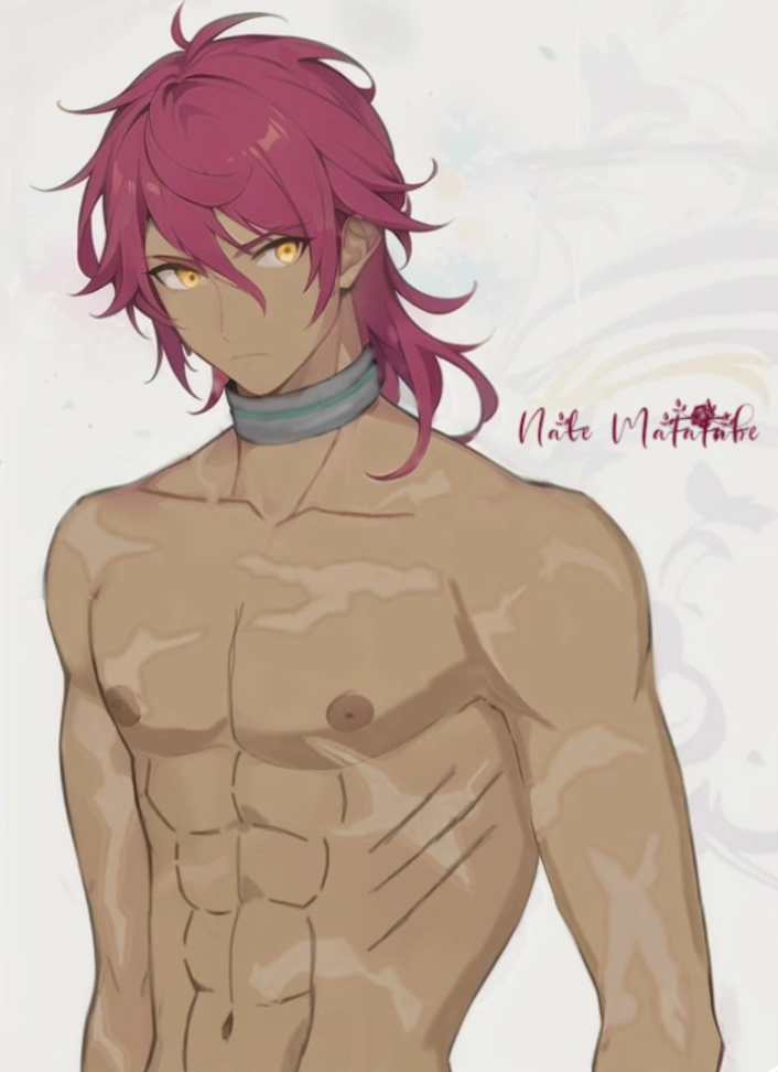 Из тёмной комнаты на свет вышел парень-метис на вид немного старше её. У него были отросшие тёмно-рыжие волосы багрового отлива, что доходили ему до надплеч, смуглая кожа, усеянная множеством грубых шрамов, горящие озлобленные огненно-оранжевые глаза… На нём не было ничего, кроме потрёпанных штанов, а на шее располагалось нечто, напоминающее ошейник.