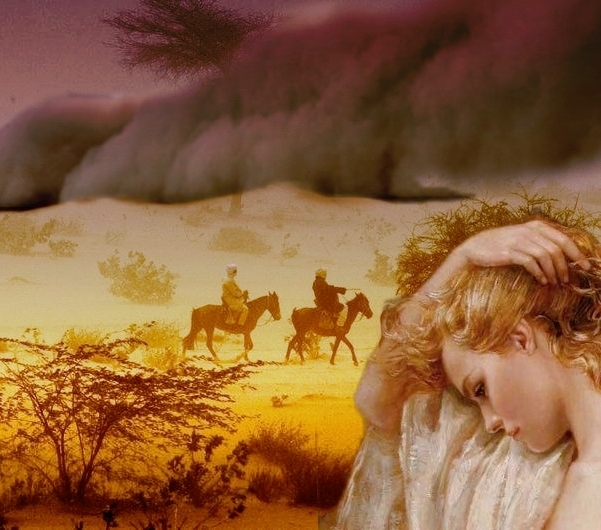 Верховые быстро попрятались в фургонах, и только Розалия, впервые оказавшаяся в пустыне, оторопев, не успела спрятаться от бури, как и юноша, который, слезая с коня, запутался ногой в стремени.