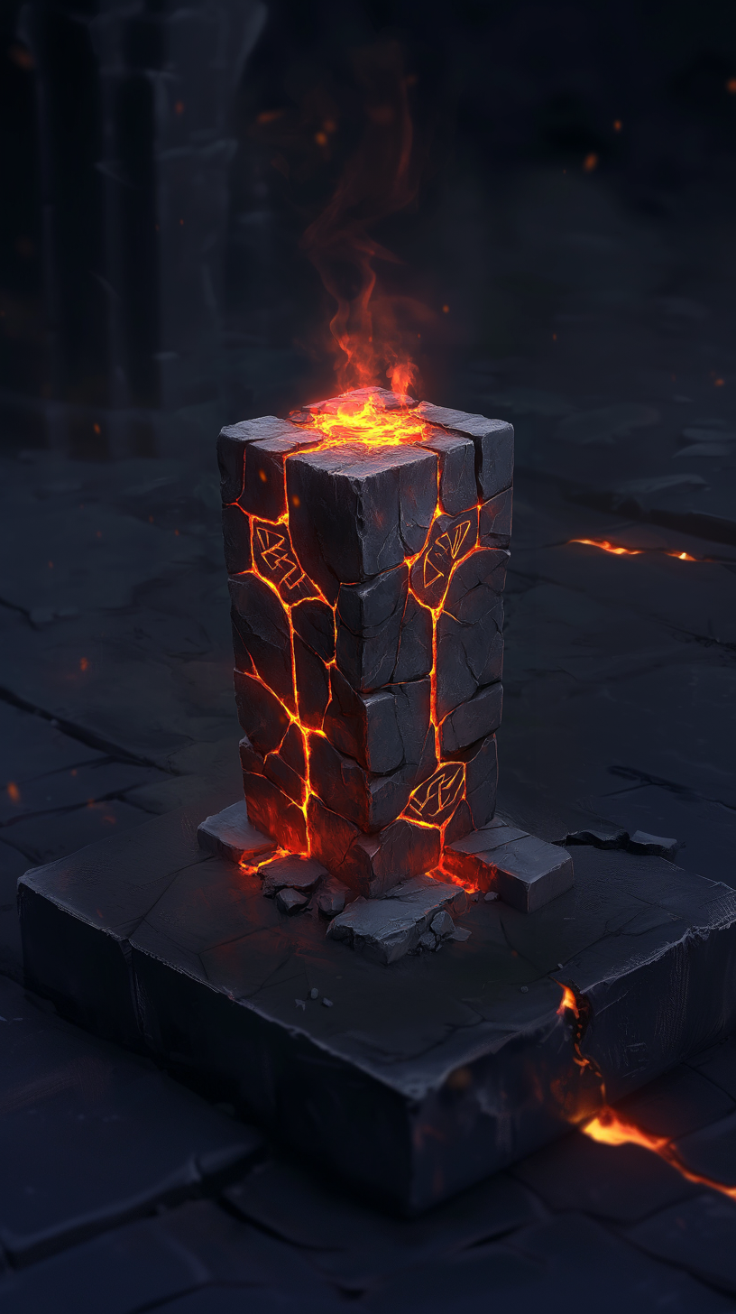 Внутри было темно и холодно, но я продолжал двигаться вперёд. Нашёл зал, где по легендам должен был бурлить лавовый фонтан. Но вместо этого передо мной возвышалась застывшая глыба пепла и лавы, окружённая каменным поясом со странными знаками. Эти знаки слабо мерцали, их огненное свечение притягивало взгляд.