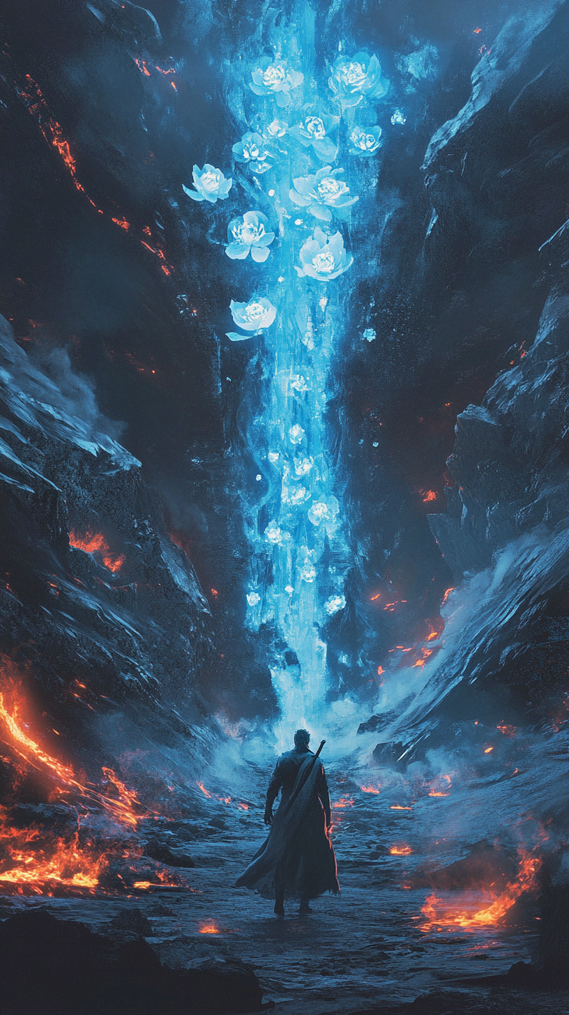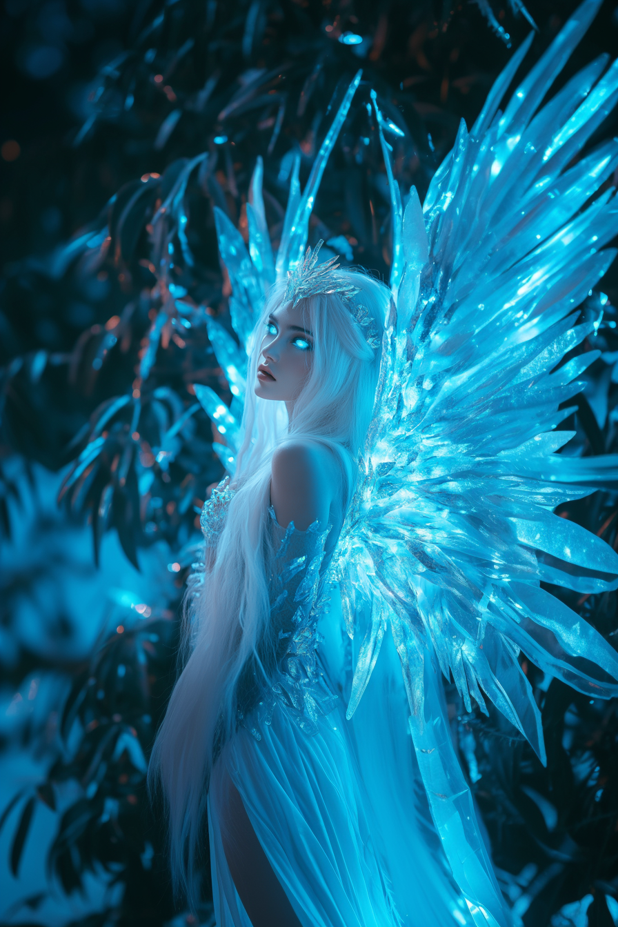 Передо мной стояло существо. Она появилась из ниоткуда. Женщина — если это можно было назвать женщиной — с кожей, белой как снег, и волосами, словно из светящегося льда. На её голове красовались необычные цветы, такие же, как покрывали её хрупкое тело, словно плащ.