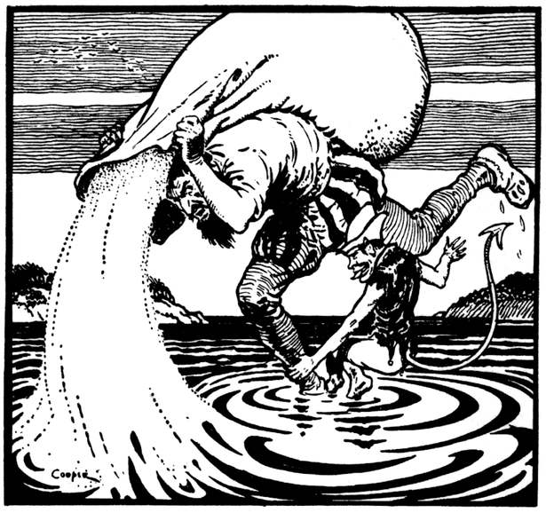 Bledhen wosa bledhen y hwre Tregeagle oberi gans y grogen, mes an lynn a vedha hwath an keth! - Год за годом Трегигл трудился со своей раковиной, но пруд всегда оставался неизменным!