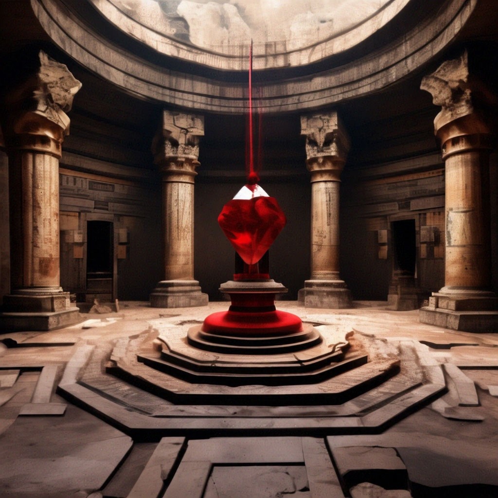 Моя голова болела, и разговоры мужчин я слышала будто через толщу воды. Звучала музыка, и именно она казалась самой важной здесь. Я двинулась вперед. Большой зал, встретивший нас, был восьмиугольным, это я уже рассмотрела потом, а сейчас шла в самый его центр. Небольшой постамент возвышался примерно на полтора метра. Его вершину венчала каменная чаша, а над ней будто висел в воздухе и медленно вращался красный камень.