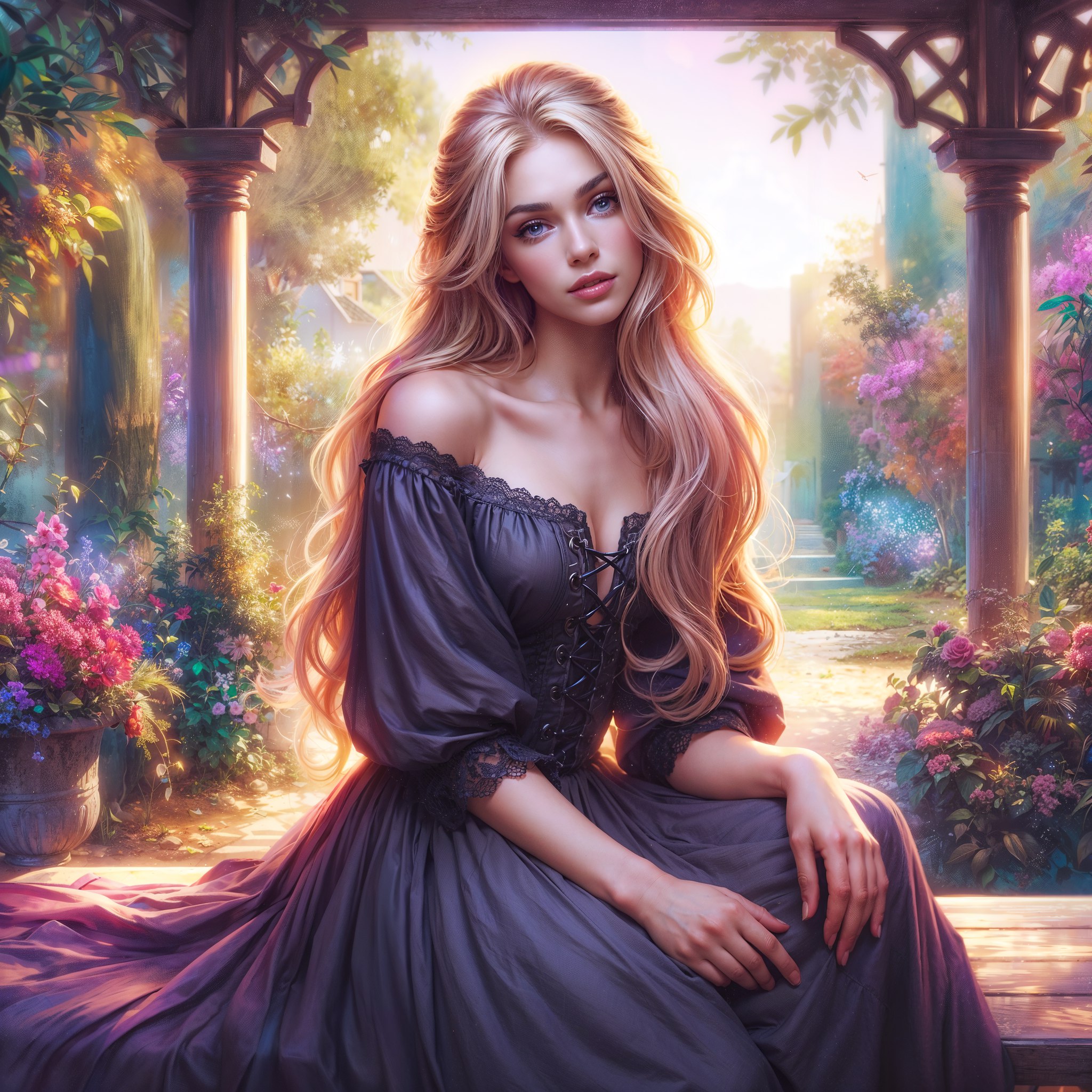 Изящное лицо сердечком, пухлые ровные губы, большие голубые глаза, аккуратный прямой нос. Длинные светлые вьющиеся волосы струились по плечам и выглядели как настоящий шёлк, хоть и были растрёпаны.