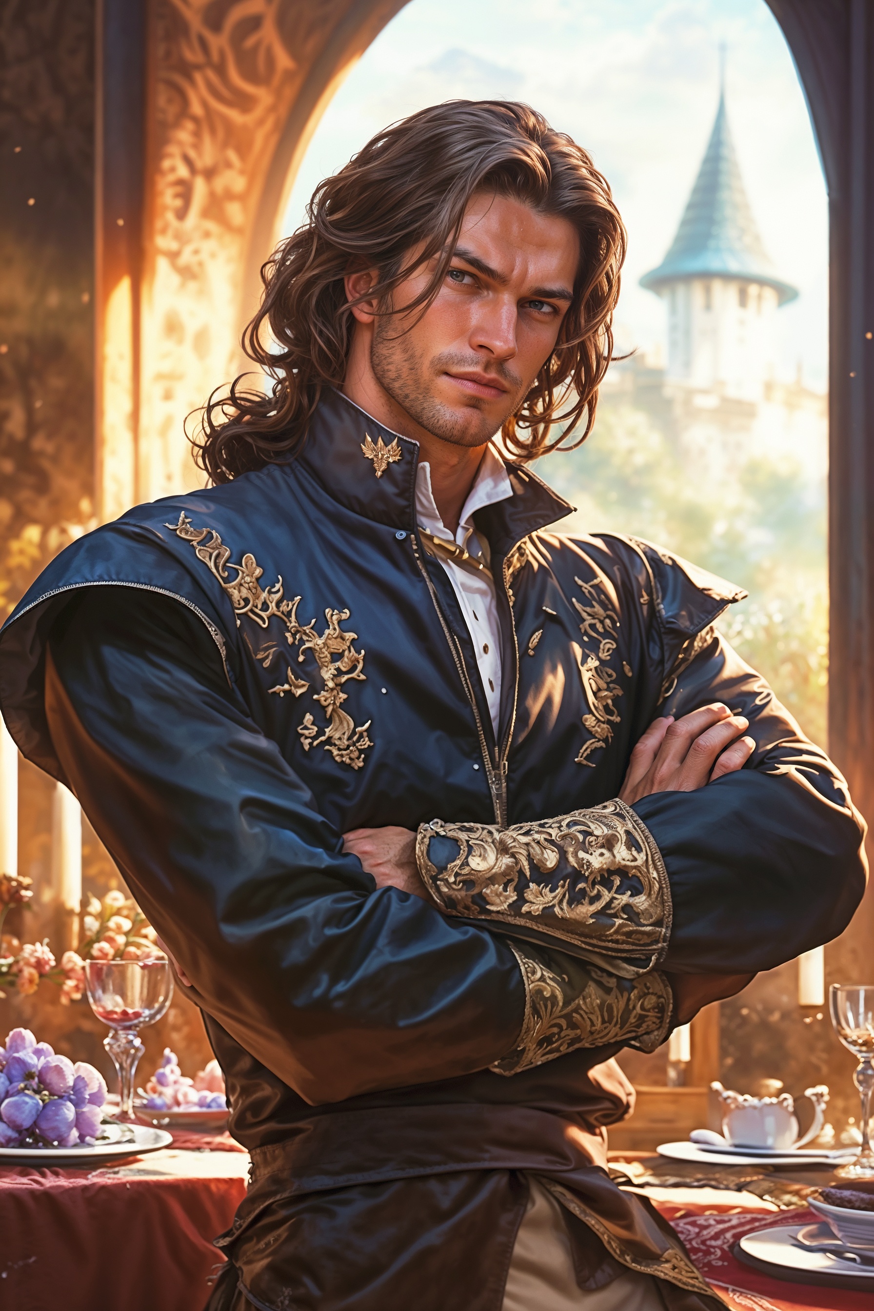 Длинные темные волосы, собранные в небрежный хвост на затылке, широкие плечи, рельефный торс, узкие бедра. И это все богатство я могу рассмотреть из-за отсутствия рубашки, как будто мужчина спешно вылез из постели, только и успел, что схватить длинный, отражающий пламя немногочисленных свечей меч.