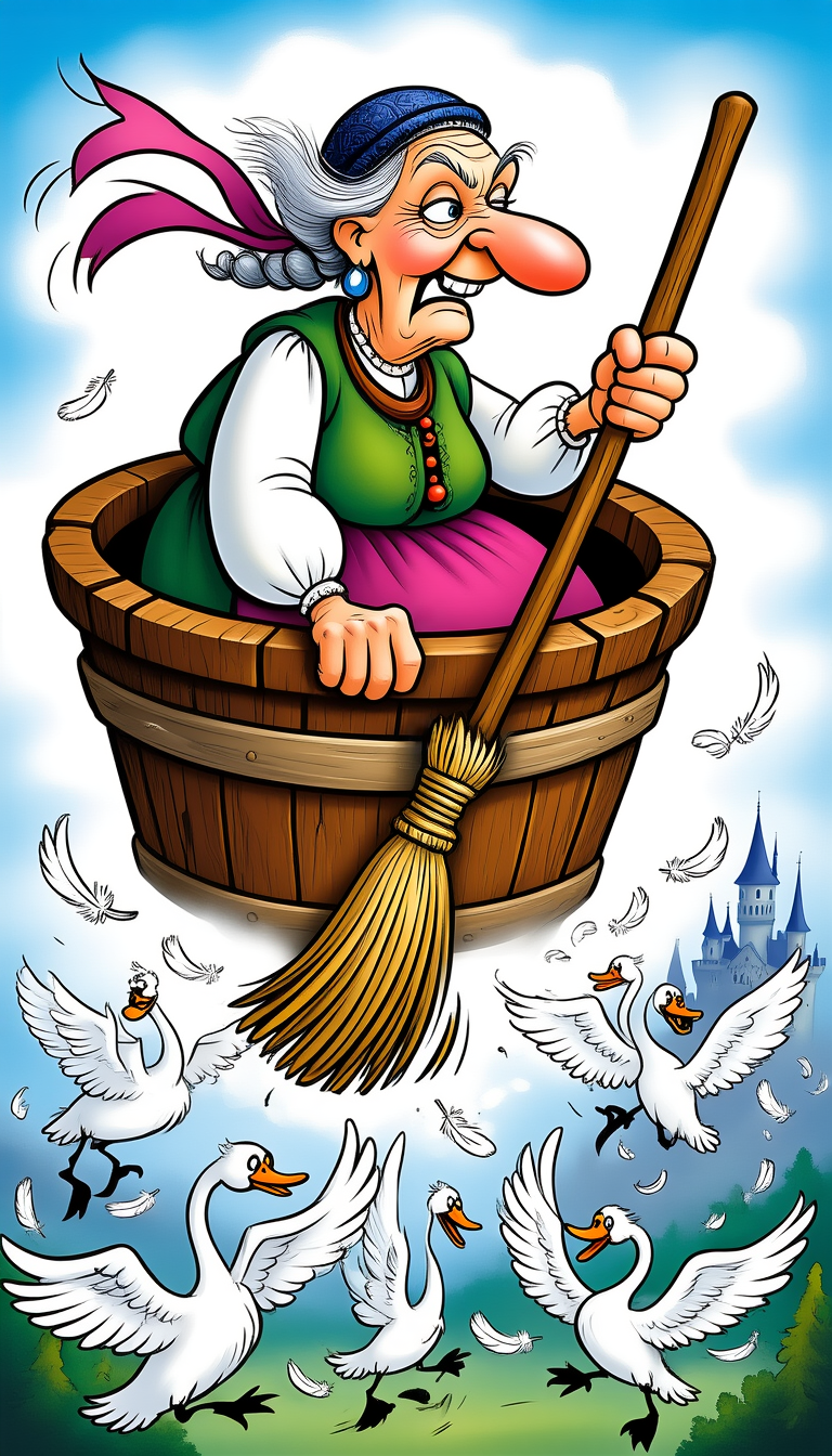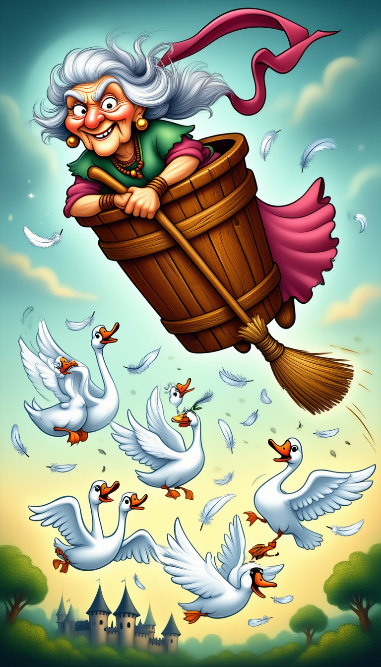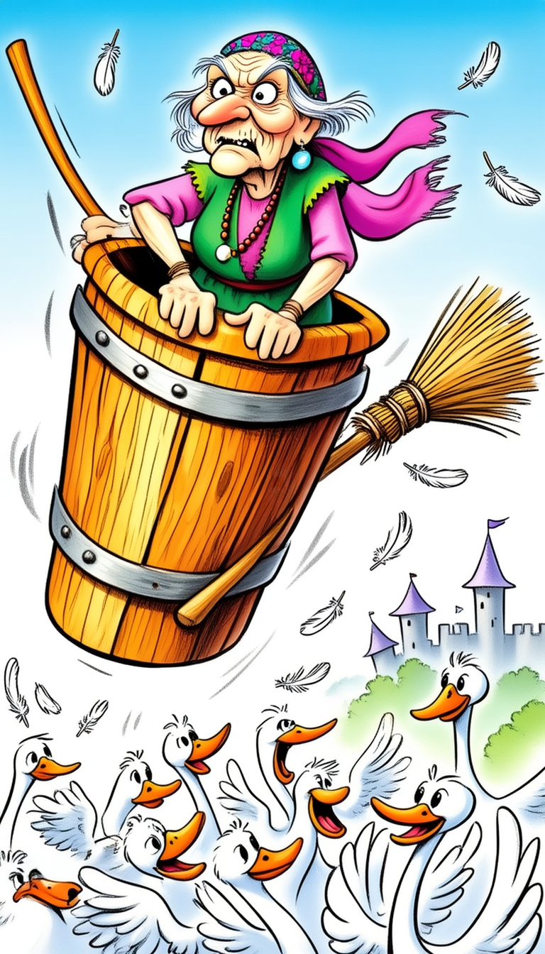 Баба Яга рассекала воздух ступой, ловко загребала его помелом. Им же придавала ускорение зазевавшимся птицам и разгоняла надоедливую мошкару. Несмотря на то, что всё её тело ныло, Ядвига Миродаровна наслаждалась полётом. Ещё бы — в столь почтенном возрасте очень вредно просыпаться на полу под лавкой.