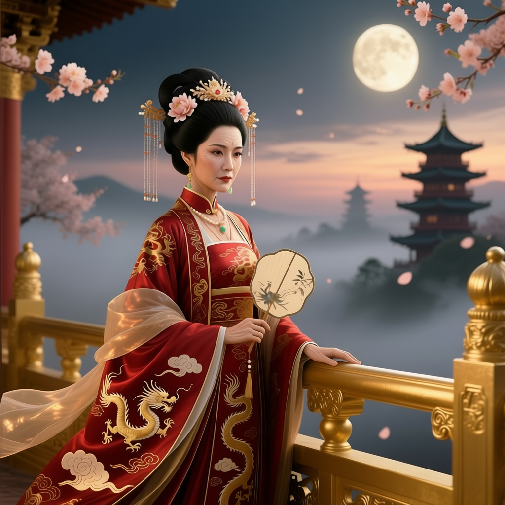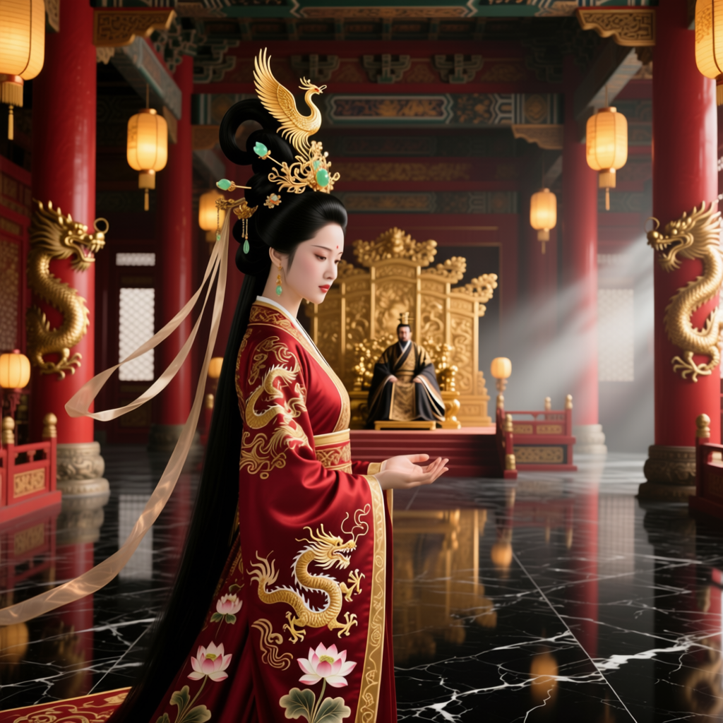 Поодаль, в почтительной, но оттого не менее давящей позе, замерли несколько склонённых, безликих фигур в строгих тёмных одеждах. Евнухи. Их каменное, отрешённое молчание было почти осязаемым.