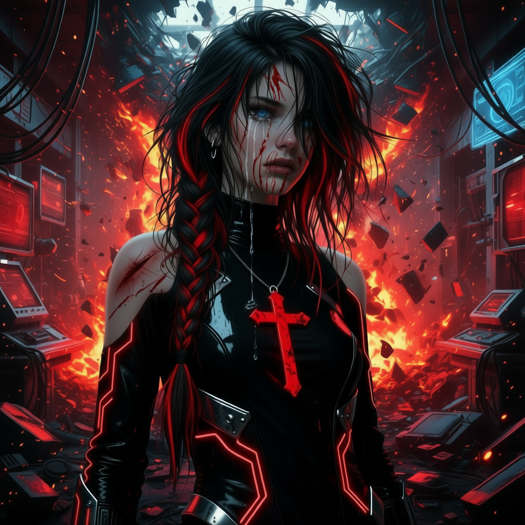 Его кровавый, бездушный взгляд медленно скользнул по мёртвым, задержался на ней. На её бледном, запылённом лице, на спутанных чёрно-красных волосах и на глазах, в которых страх уже сменялся осколками былого льда. В нём не было ни ненависти, ни гнева. Лишь холодное, отстранённое любопытство, с каким программист смотрит на последний глючный процесс в системе, который нужно завершить.