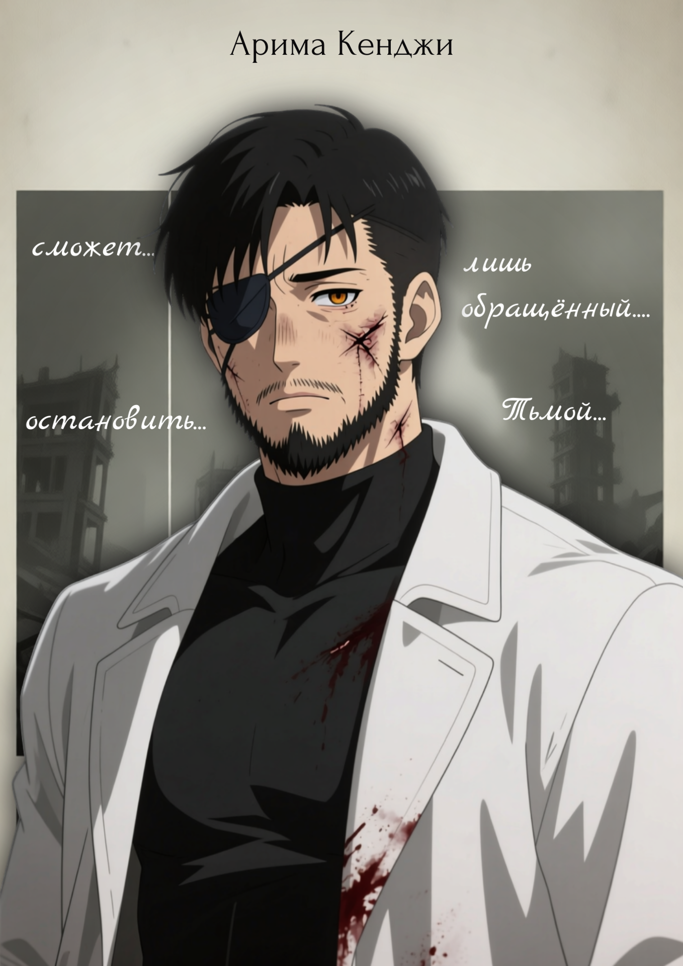 Когда я только пришёл в ЦОДСА, Арима был назначен моим напарником и наставником. Да, он человек, просто человек, без каких-либо экстравагантных способностей. В бою использует кувалду, ради которой, как он любит говорить, и посещает качалку. Ему двадцать восемь, всего на три с небольшим года старше меня, однако из-за щетины, мускулатуры и грозного задолбавшегося взгляда выглядит на все сорок. Со стороны он кажется опасным суровым дядькой, однако только мы с Эдвардом (не считая всего остального отдела) знаем, каким он порой бывает сентиментальным. Арима для нас как старший брат, который всегда и во всём поможет. А ещё…