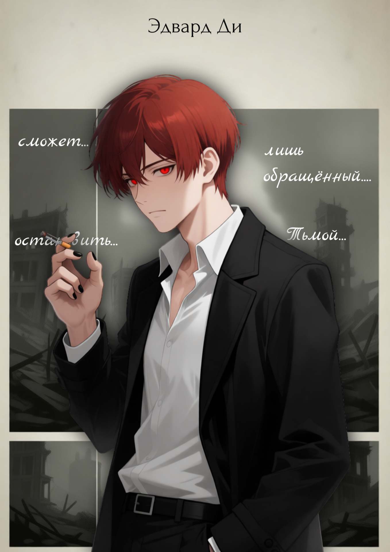 От Аримы Эдвард кардинально отличается. Ростом он ниже нас, да и на пять лет младше меня. Эд, как и я, вампир, будет точнее сказать дампир – полукровка, рождённый от союза человека и вампира. Для него солнечные лучи не представляют угрозы, однако в солнечную погоду он шипит похлеще меня. Худощавое телосложение и смазливое личико создают иллюзию его безобидности, однако в хладнокровии и мастерстве владения клинком ему нет равных, но вот характером он не удался от слова совсем, слишком уж эмоциональный, отчего всегда рвётся в бой первым. Собственно, из-за взрывного характера его и направили к нам. Опять же в отличие от нас, Эд из знатного дома Ви – рода охотников на вампиров. Вот только на перевоспитание его отдали ещё года два назад…