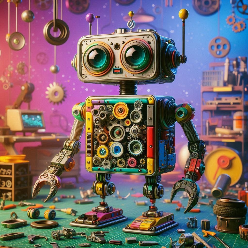 Рядом сидит мой маленький робот-помощник Лион с разноцветными пластинами корпуса. Я собрала его из того, что удалось найти по помойкам и закрытым мастерским. Когда детали выходили из строя, я заменяла их новыми, поэтому мой Лион за свою пока еще короткую жизнь в десять лет уже успел сменить пару десятков обликов.